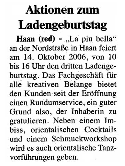 Haaner Treff: "Aktionen zum Ladengeburtstag"; Pressebericht anlässlich Geschäftspromotion / Betriebsjubiläumsfeier bei "La più bella - Basteln und mehr..." in Haan
