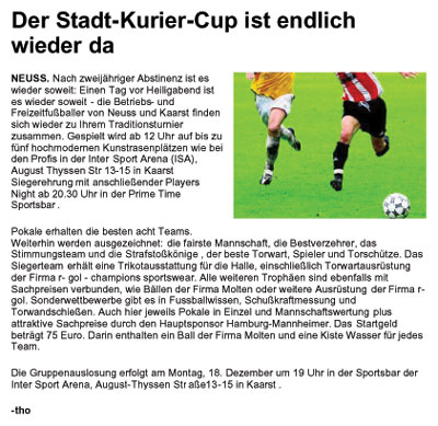 Stadt-Kurier Neuss: "Der Stadt-Kurier-Cup ist endlich wieder da"; Pressebericht zum Stadt-Kurier Cup Neuss / Kaarst 2006