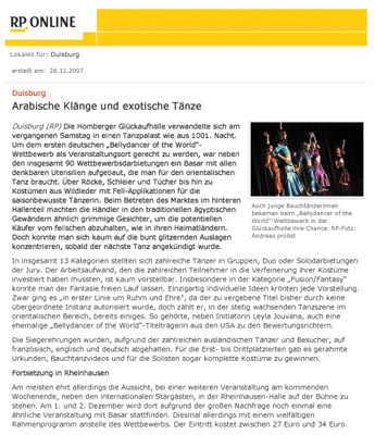 Rheinische Post - Lokales für Duisburg: "Arabische Klänge und exotische Tänze"; Pressemeldung zum "1st Bellydancer of the World Contest" / Weltmeisterschaft Bauchtanz in Duisburg - Auftritt mit dem Ensemble El Amal