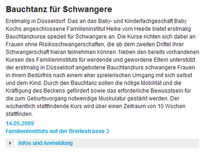 Radiosender / Lokalradio Antenne Düsseldorf: "Bauchtanz für Schwangere - Erstmalig in Düsseldorf", Pressebericht mit Vorankündigung zum neuen Bauchtanzkurs "Bauchtanz in der Schwangerschaft" - "Bauchtanz für Schwangere" ist ein Kursangebot in Kooperation mit Familieninstitut Heike vom Heede in Zusammenarbeit mit Baby Kochs Düsseldorf