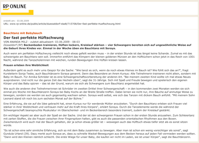 Nachrichtenportal RP ONLINE: "Der fast perfekte Hüftschwung - Bauchtanz mit Babybauch"; Pressebericht zum neuen Bauchtanzkurs "Bauchtanz in der Schwangerschaft" - "Bauchtanz für Schwangere" ist ein Kursangebot in Kooperation mit Familieninstitut Heike vom Heede in Zusammenarbeit mit Baby Kochs Düsseldorf