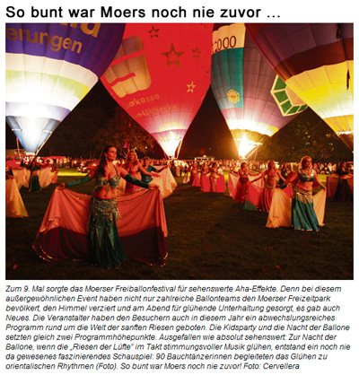 Zeitung Wochen-Magazin Moers / Kamp-Lintfort / Neukirchen-Vluyn [Westdeutsche Verlags- und Werbegesellschaft mbH & Co. KG - ein Unternehmen der WAZ Mediengruppe, Essen]: "So bunt war Moers noch nie zuvor ..." - Pressebericht zur Bauchtanz-Show beim Ballonglühen auf dem 9. Moerser Freiballonfestival [Montgolfiade] mit 90 Bauchtänzerinnen unter der künstlerischen und organisatorischen Gesamtleitung von Bauchtänzerin Soraya