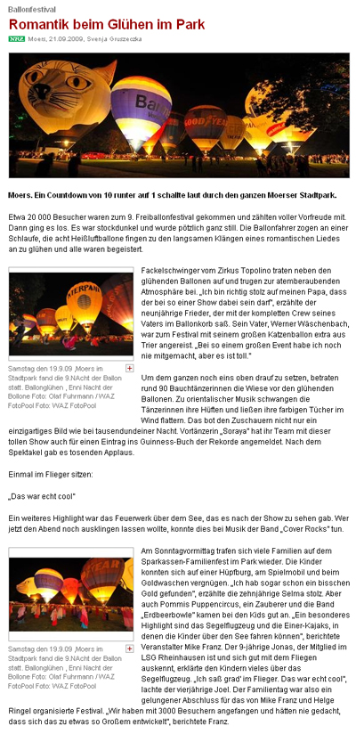 Nachrichtenportal DerWesten - Das Portal der WAZ Mediengruppe [Essen]: "Moers: Ballonfestival - Romantik beim Glühen im Park" - Pressebericht zur Bauchtanz-Show beim Ballonglühen auf dem 9. Moerser Freiballonfestival [Montgolfiade] mit 90 Bauchtänzerinnen unter der künstlerischen und organisatorischen Gesamtleitung von Bauchtänzerin Soraya
