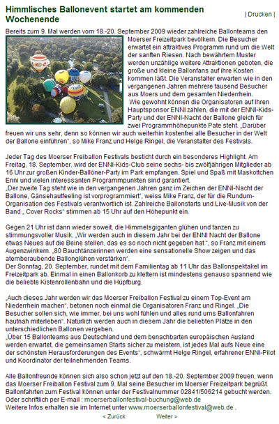 Niederrheinzeitung (Ihre Online Regionalzeitung aus Xanten): "Himmlisches Ballonevent startet am kommenden Wochenende - Bereits zum 9. Mal werden vom 18.-20. September 2009 wieder zahlreiche Ballonteams den Moerser Freizeitpark bevölkern. Die Besucher erwartet ein attraktives Programm rund um die Welt der sanften Riesen." - Pressebericht zur Bauchtanz-Show beim Ballonglühen auf dem 9. Moerser Freiballonfestival [Montgolfiade] mit 90 Bauchtänzerinnen unter der künstlerischen und organisatorischen Gesamtleitung von Bauchtänzerin Soraya