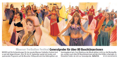 Zeitung Rheinische Post - Der Grafschafter [Moers, Kamp-Lintfort, Neukirchen-Vluyn, Rheurdt]: "Moerser Freiballon Festival: Generalprobe für über 80 Bauchtänzerinnen - Die Vorbereitungen für das neunte Moerser Freiballon Festival sind so gut wie abgeschlossen. Vom 18. bis 20. September wartet ein buntes und spannendes Programm auf die Besucher. Höhepunkt wird das Ballonglühen am Samstagabend sein. Zum Rhythmus der Musik glühen nicht nur die Montgolfieren, sondern auch über 80 Bauchtänzerinnen werden ihre Hüften schwingen. In Düsseldorf trafen sie sich zur Generalprobe." - Pressebericht zur Bauchtanz-Show beim Ballonglühen auf dem 9. Moerser Freiballonfestival [Montgolfiade] mit 90 Bauchtänzerinnen unter der künstlerischen und organisatorischen Gesamtleitung von Bauchtänzerin Soraya