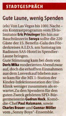 Rheinische Post: "Stadtgespräch - Gute Laune, wenig Spenden"; Pressemeldung zur Benefizgala AIDS 2005 des Förderkreises A.I.D.S. e.V., Düsseldorf